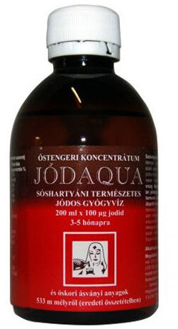 JÓDAQUA TERMÉSZETES JÓDOS GYÓGYVÍZ Előnyök: A gyógyvíz jódon kívül további számos makro- és mikroelemet is tartalmaz, melyek együttes szinergista (egymás felszívódását erosítő) hatása hozzájárul a magasabb fokú hasznosuláshoz. 100%-ban természetes eredetű, igazolt élettani hatással bíró őstengeri koncentrátum. A gyógyvíz 200 ml-es kiszerelésben - mely az adagolás függvényében 3-6 hónapra elegendő jódpótlást biztosít ...